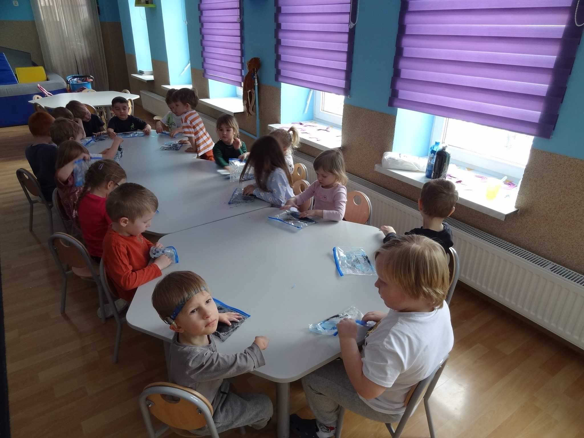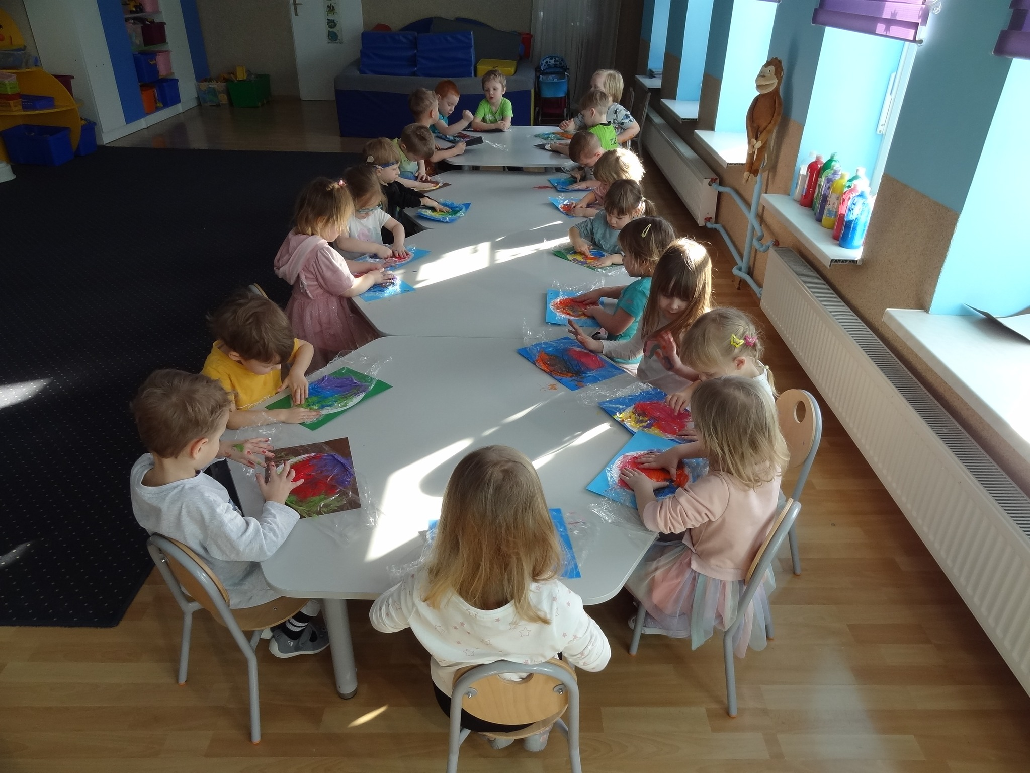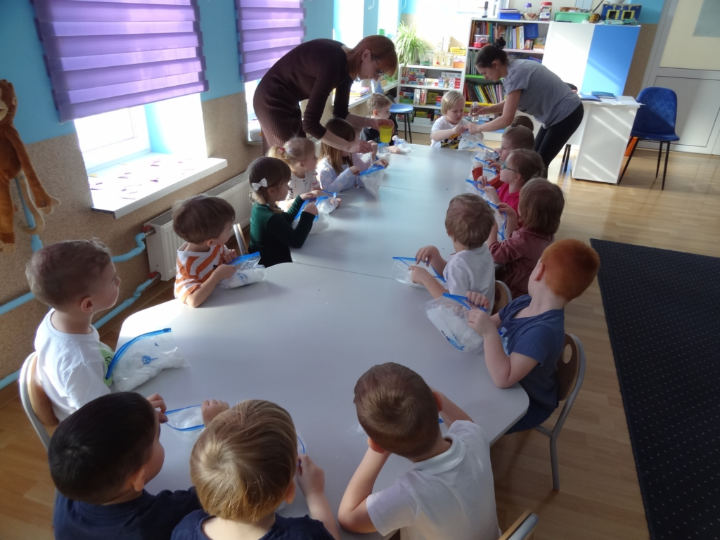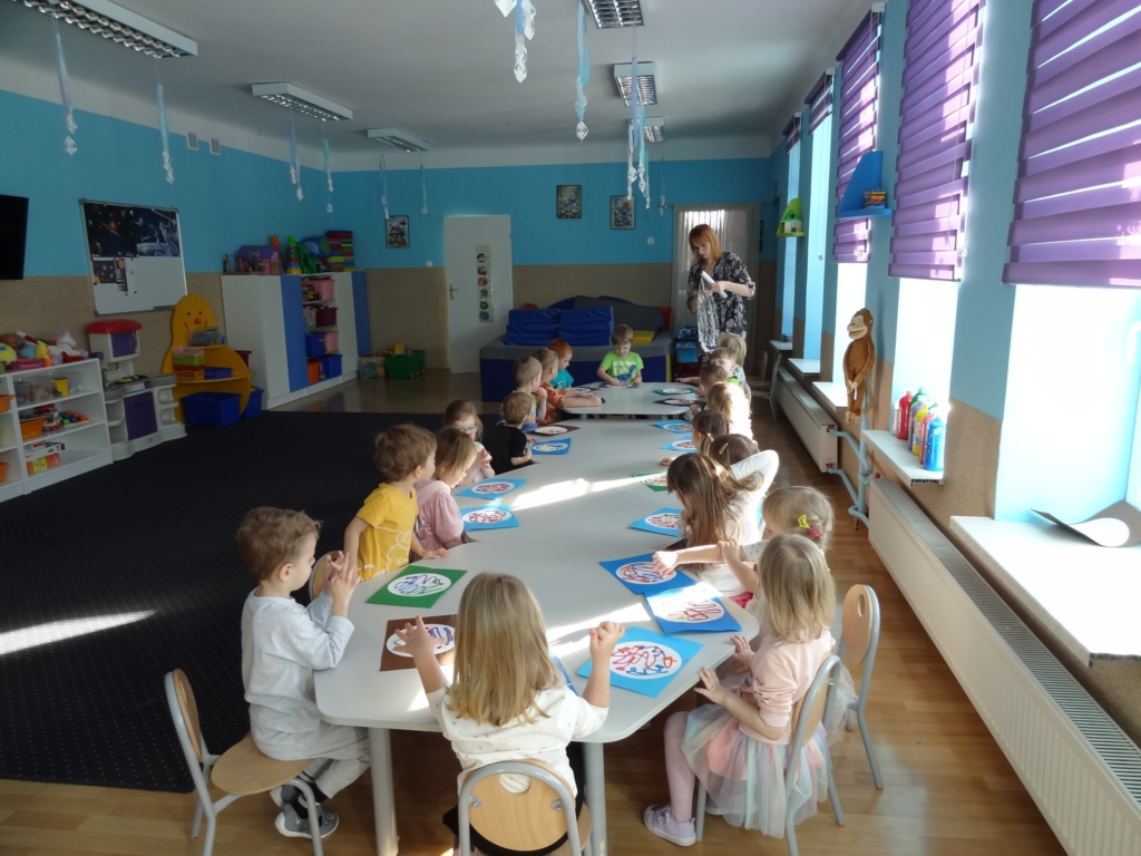 16 lutego odbyły się warsztaty plastyczne „Moja Planeta”. Malowanie pod folią spożywczą było doskonałą zabawą sensoryczną, która pozwoliła dzieciom na swobodne eksperymentowanie z kolorem bez bezpośredniego kontaktu z farbą.