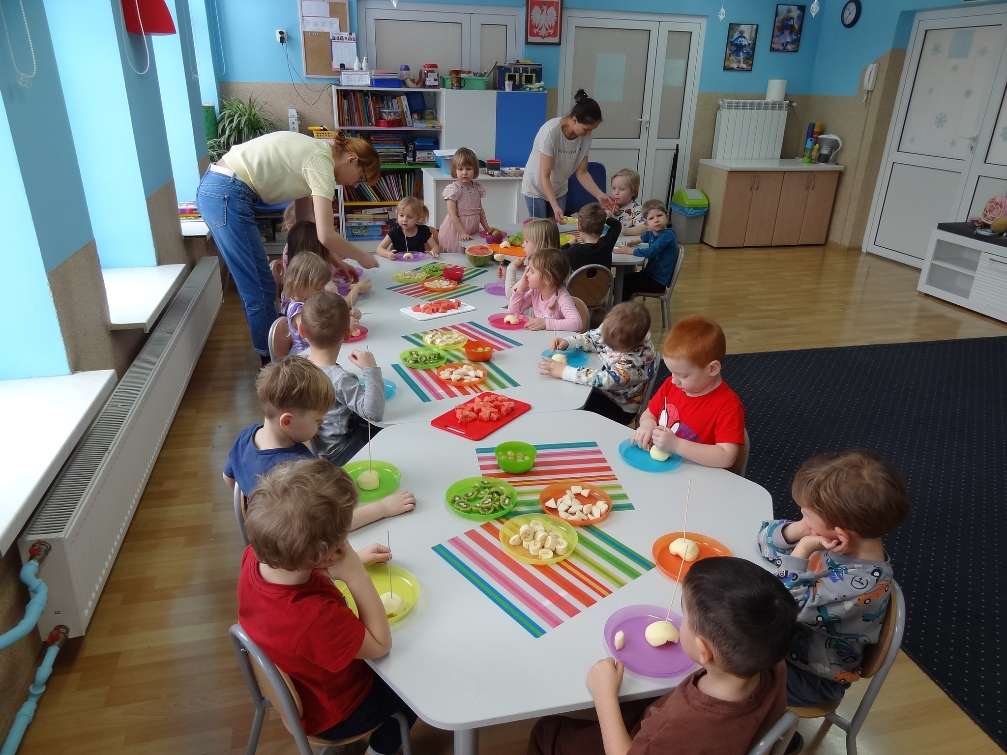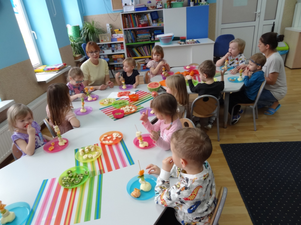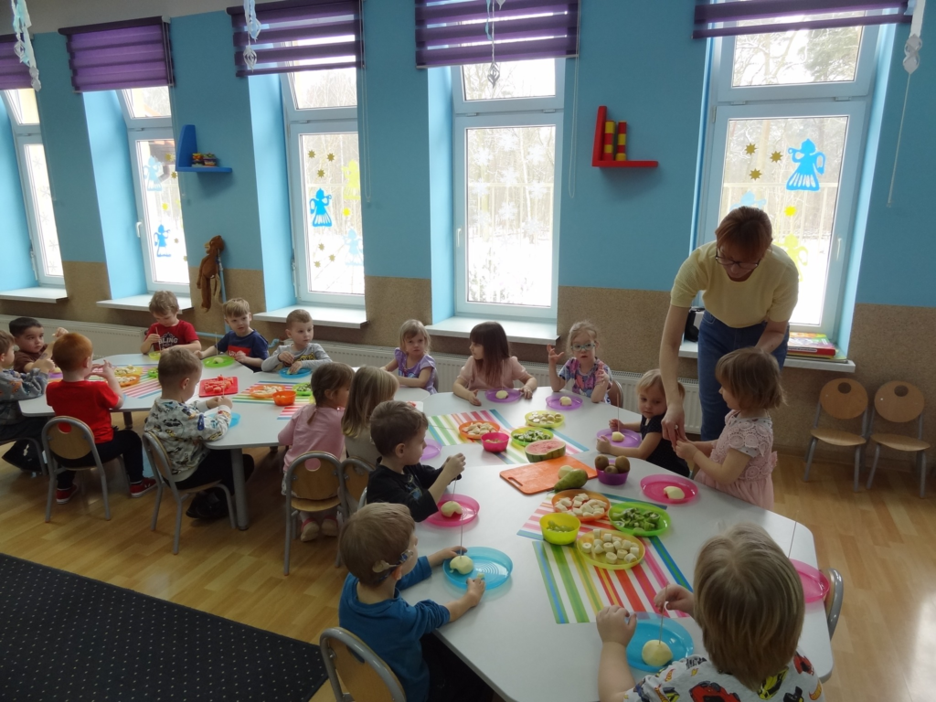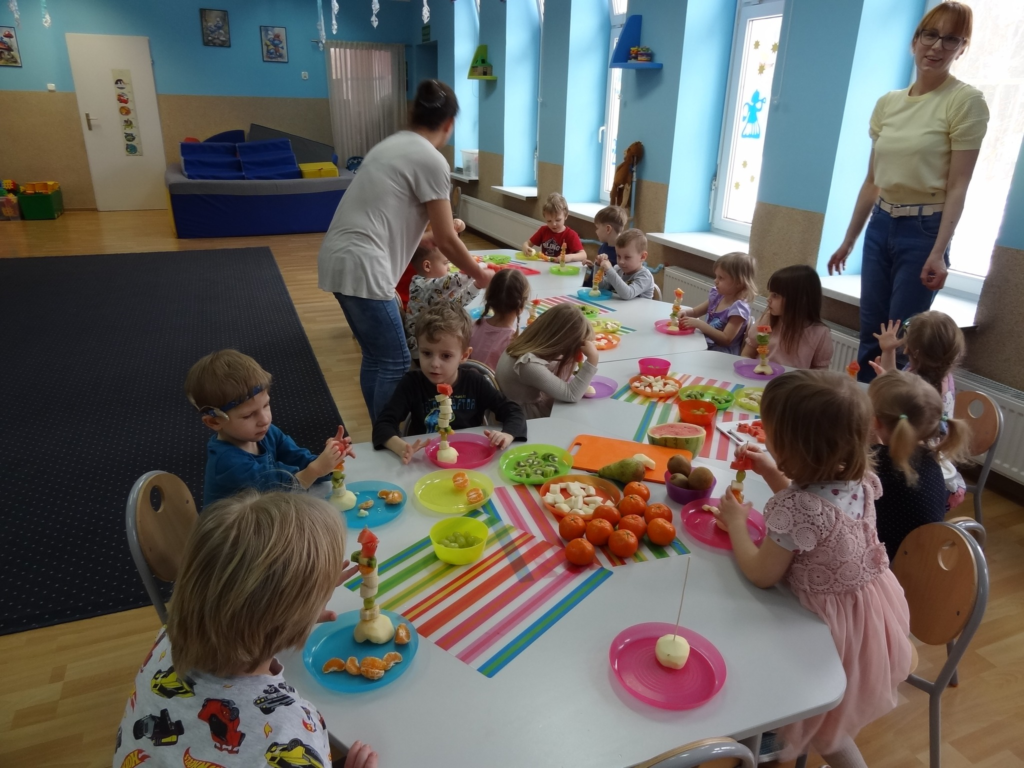 18 lutego maluchy podczas warsztatów kulinarnych przygotowały „Rakiety z owoców”. Dzieci tworzyły jadalne statki kosmiczne, wykorzystując owoce jako elementy konstrukcyjne, co rozwijało ich wyobraźnię, motorykę małą oraz było zachętą do jedzenia zdrowych przekąsek.