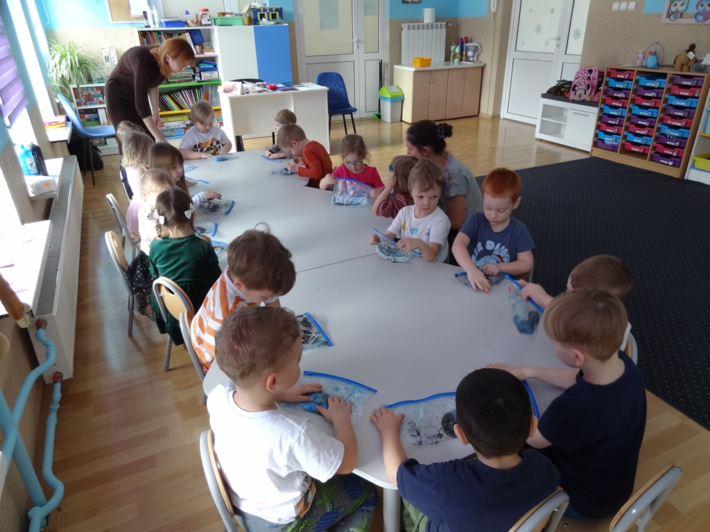 19 lutego wykonaliśmy kosmiczny eksperyment „Moja własna galaktyka” z wykorzystaniem woreczków, waty, farby, oleju, wody i brokatu. Przedszkolaki delikatnie naciskały palcami tak, aby połączyć wszystkie składniki ze sobą.
