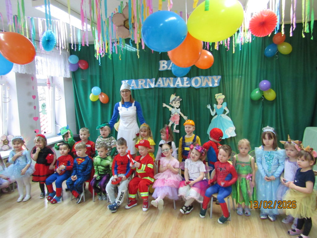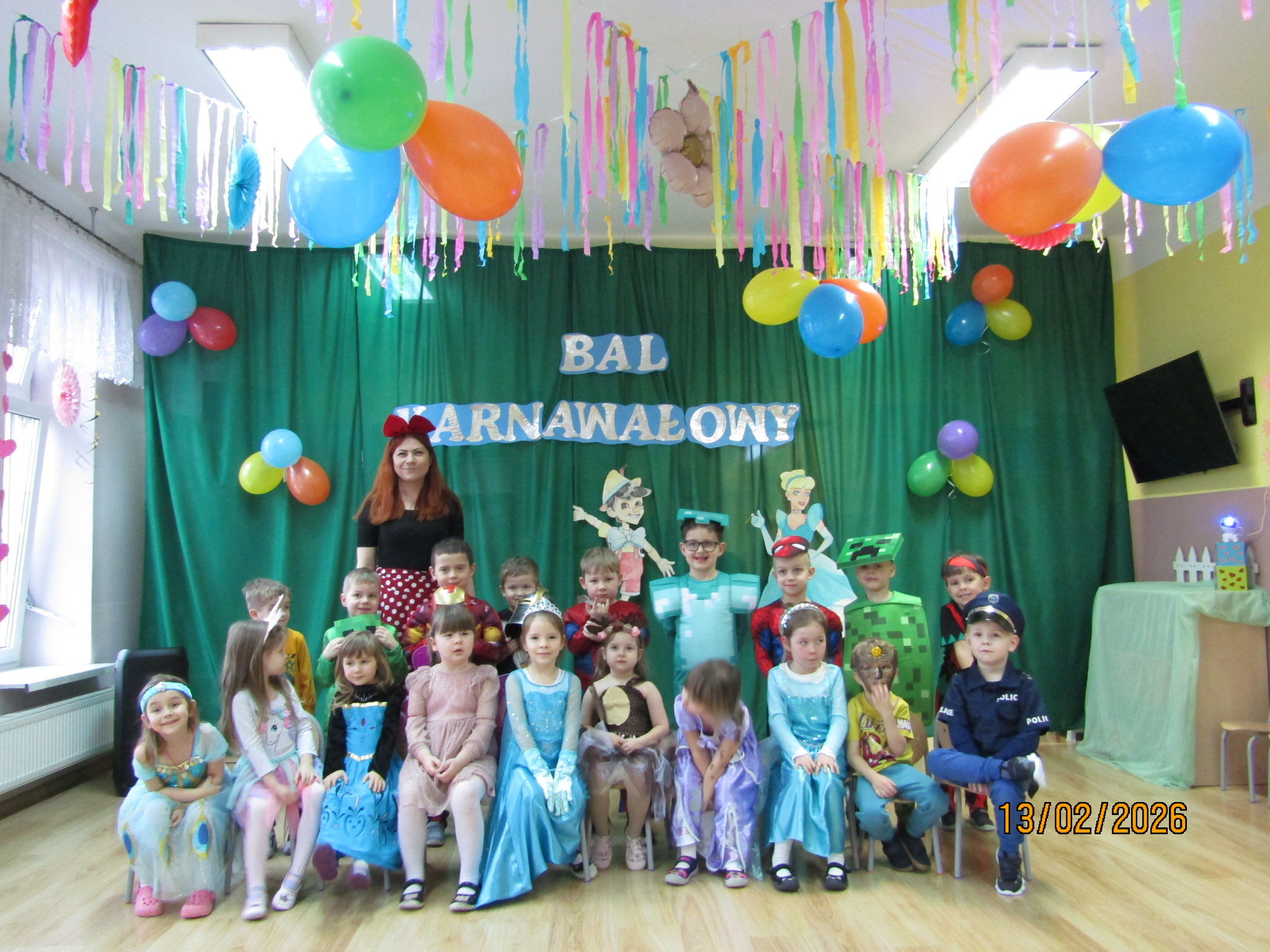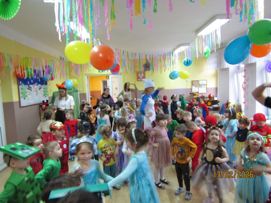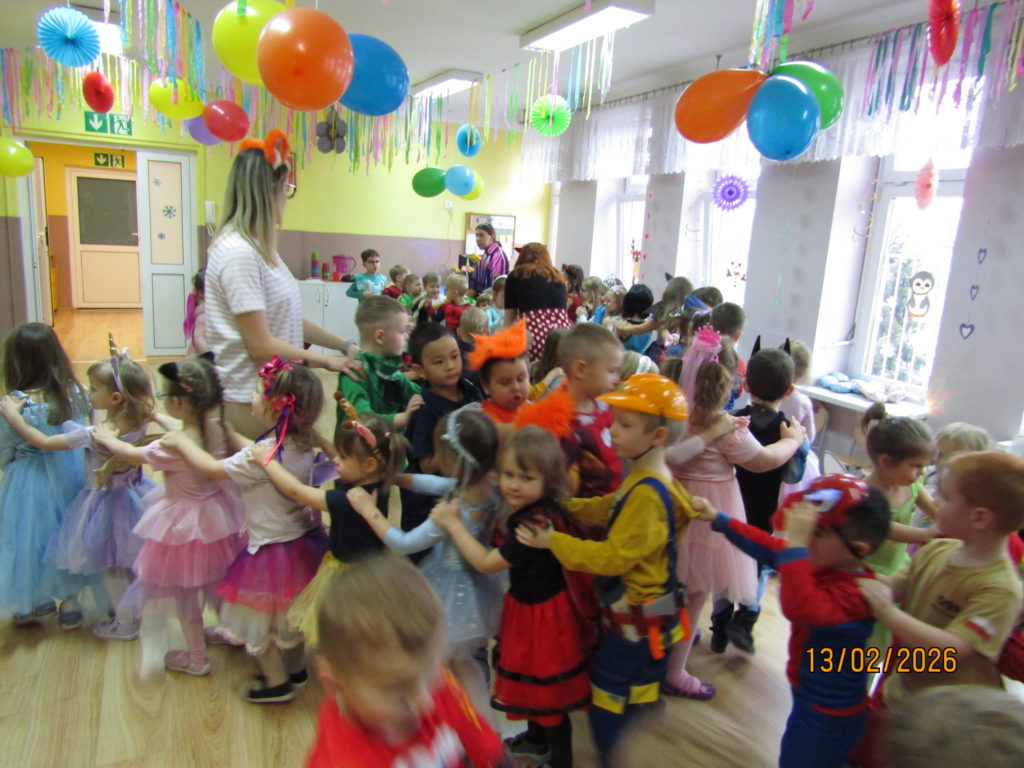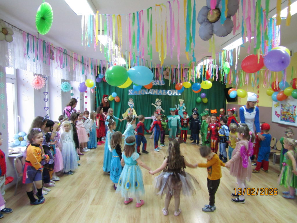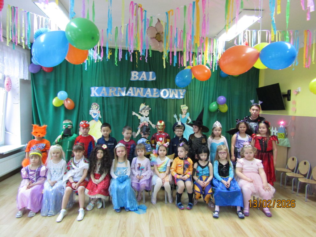 Tego dnia sala wypełniła się kolorowymi postaciami – dzieci przyszły w pięknych i pomysłowych przebraniach, tworząc prawdziwie bajkową atmosferę. Podczas balu nie zabrakło wspólnych zabaw, tańców oraz mnóstwa uśmiechu i dobrej energii. Na uczestników czekał również smaczny poczęstunek, który dodał sił do dalszej zabawy.