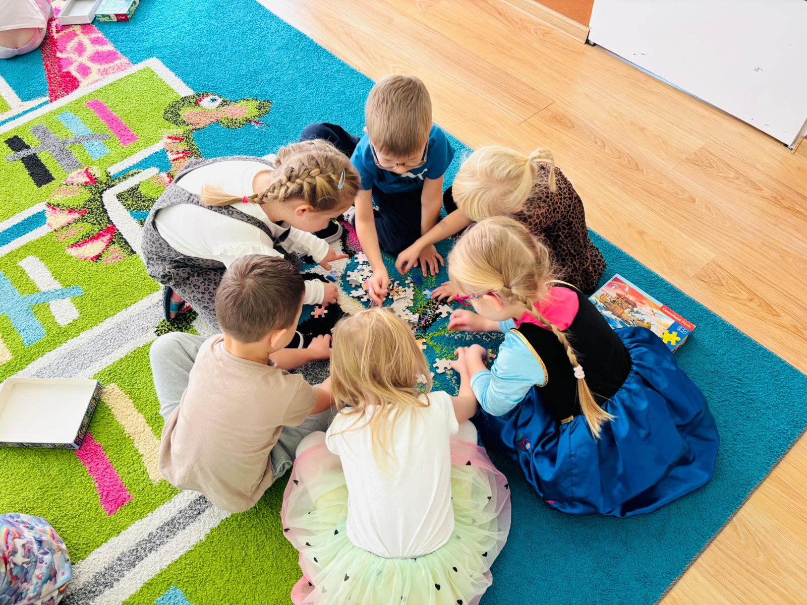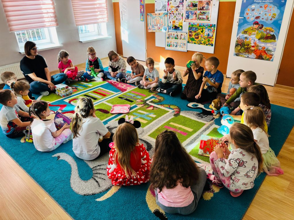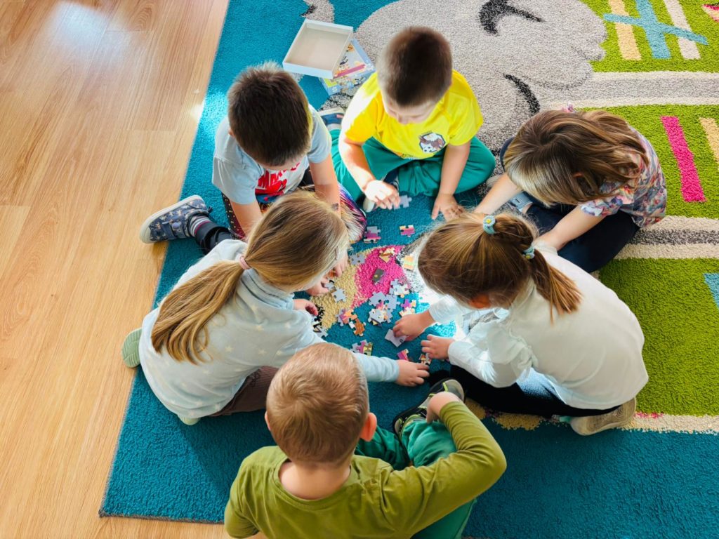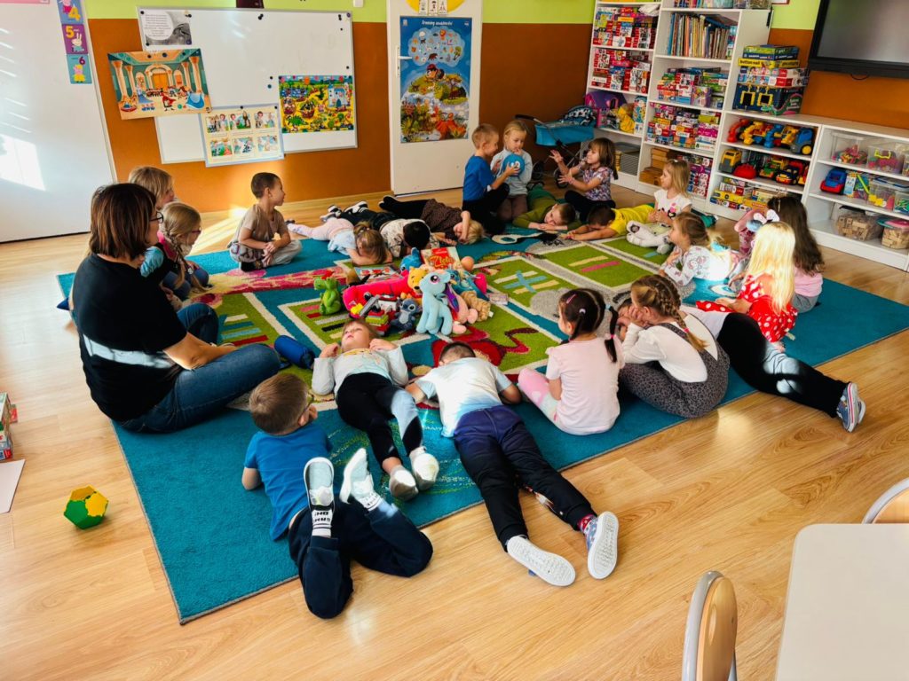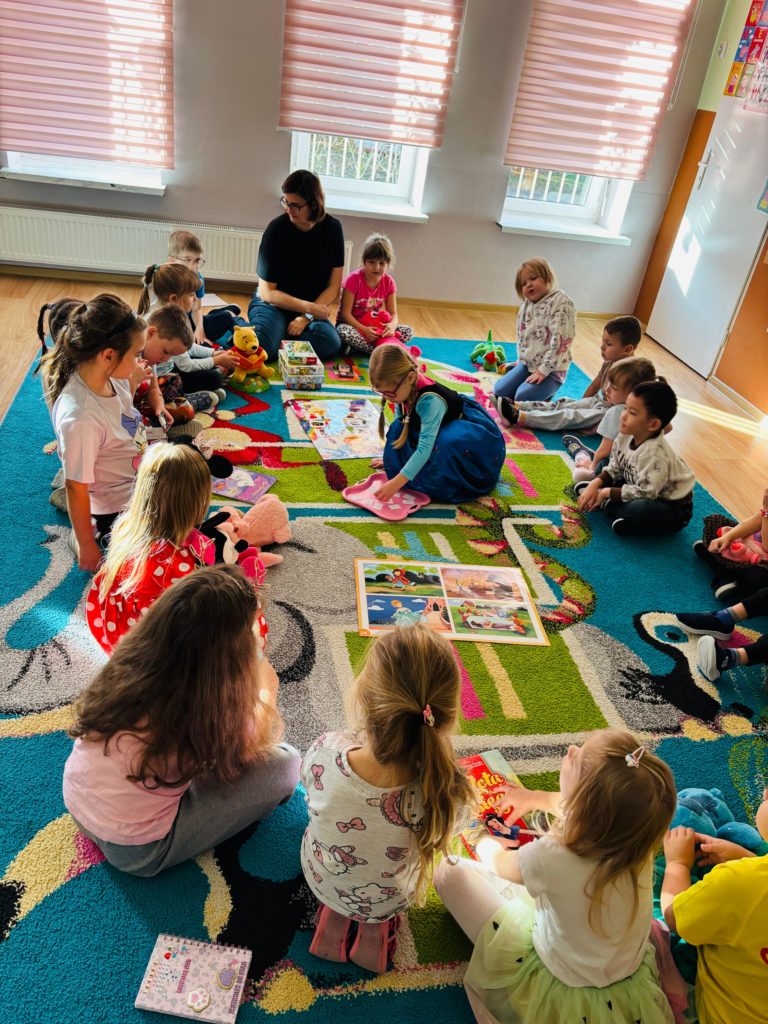 Dzieci zaprezentowały swoje bajkowe zabawki. Uczestniczyły w zabawach: Magiczny eliksir, Zatrute jabłko oraz w zgadywankach o bajkach. Na koniec dzieci podzielone na zespoły układały puzzle i wykonały pracę plastyczną „Moja ulubiona postać z bajki” 🎨