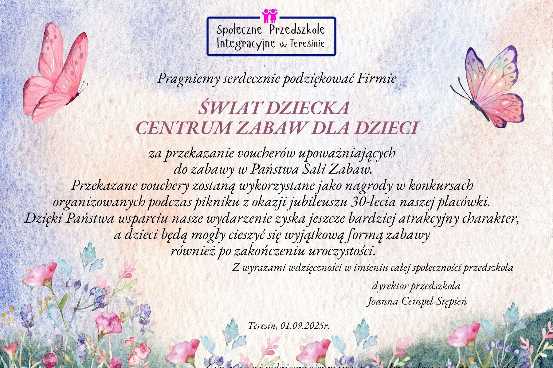 Podziękowanie dla Firmy Świat Dziecka Centrum Zabaw dla Dzieci