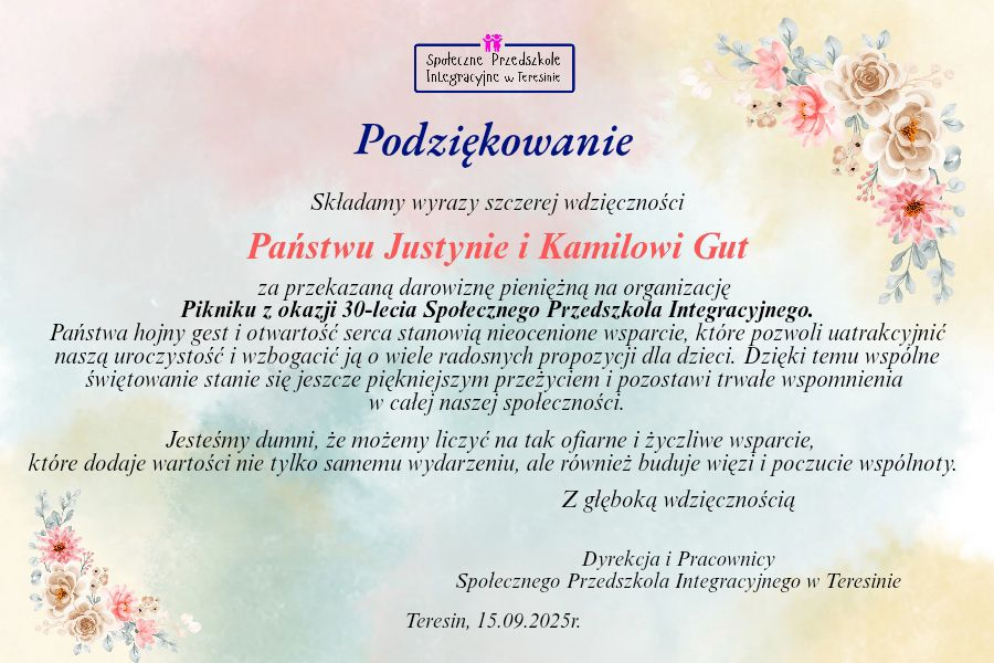 Podziękowanie Państwu Justynie i Kamilowi Gut