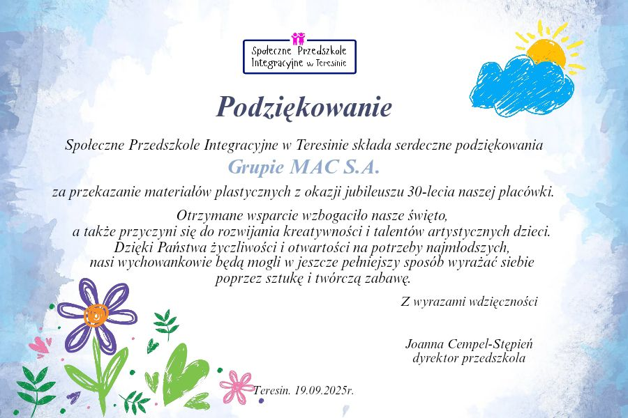 ponad 20 lat doświadczenia | najwyższe standardy edukacyjne | przyjazna atmosfera ZOBACZ OFERTĘ SPOŁECZNE PRZEDSZKOLE INTEGRACYJNE w TERESINIE w TERESINIE SPOŁECZNE PRZEDSZKOLE INTEGRACYJNE ponad 20 lat doświadczenia | najwyższe standardy edukacyjne | przyjazna atmosfera ZOBACZ OFERTĘ w TERESINIE SPOŁECZNE PRZEDSZKOLE INTEGRACYJNE Zapisy do naszego przedszkola są przyjmowane przez cały rok! ZAPISZ DZIECKO w TERESINIE SPOŁECZNE PRZEDSZKOLE INTEGRACYJNE Tu zawsze dużo się dzieje! Uczymy przez zabawę, doświadczenia, warsztaty i wycieczki! AKTUALNOŚCI