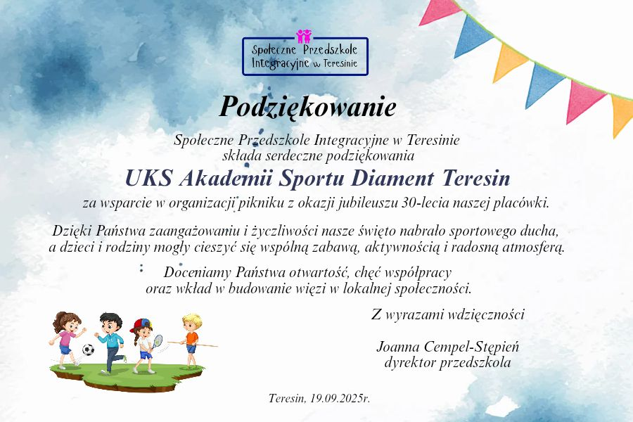 Podziękowanie UKS Akademii Sportu Diament Teresin