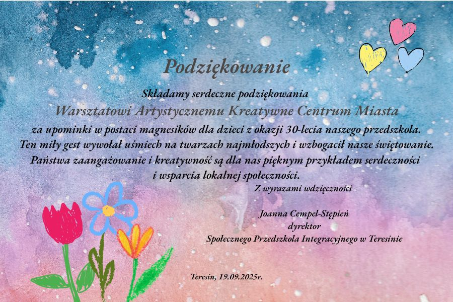 Podziękowanie Warsztatowi Artystycznemu Kreatywne Centrum Miasta