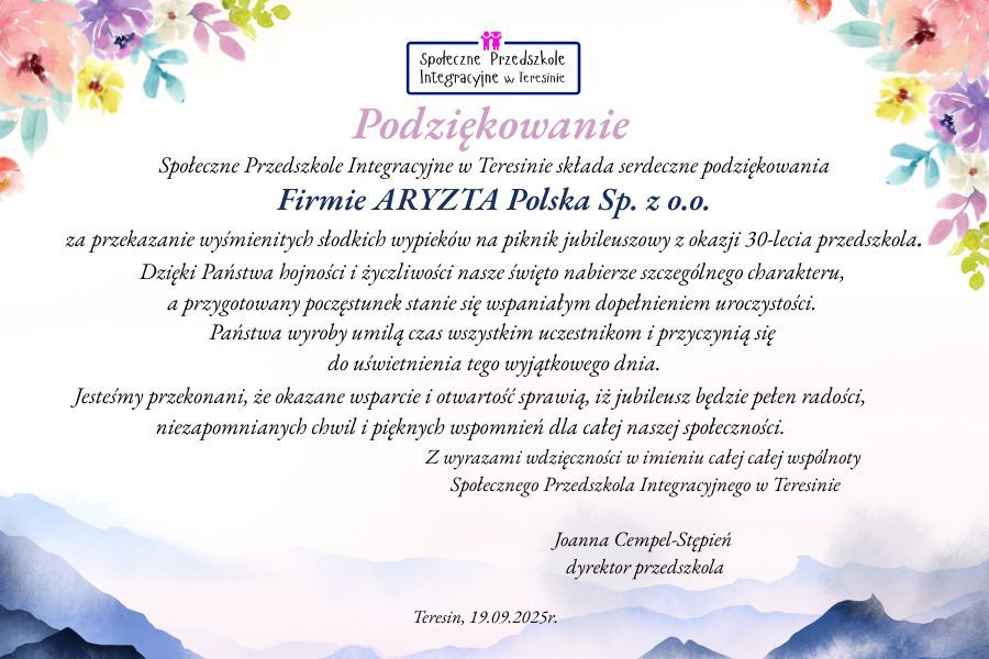 Podziękowanie Firmie ARYZTA Polska Sp. z o.o.