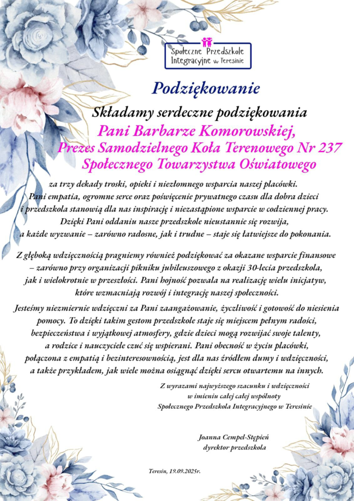ponad 20 lat doświadczenia | najwyższe standardy edukacyjne | przyjazna atmosfera ZOBACZ OFERTĘ SPOŁECZNE PRZEDSZKOLE INTEGRACYJNE w TERESINIE w TERESINIE SPOŁECZNE PRZEDSZKOLE INTEGRACYJNE ponad 20 lat doświadczenia | najwyższe standardy edukacyjne | przyjazna atmosfera ZOBACZ OFERTĘ w TERESINIE SPOŁECZNE PRZEDSZKOLE INTEGRACYJNE Zapisy do naszego przedszkola są przyjmowane przez cały rok! ZAPISZ DZIECKO w TERESINIE SPOŁECZNE PRZEDSZKOLE INTEGRACYJNE Tu zawsze dużo się dzieje! Uczymy przez zabawę, doświadczenia, warsztaty i wycieczki! AKTUALNOŚCI