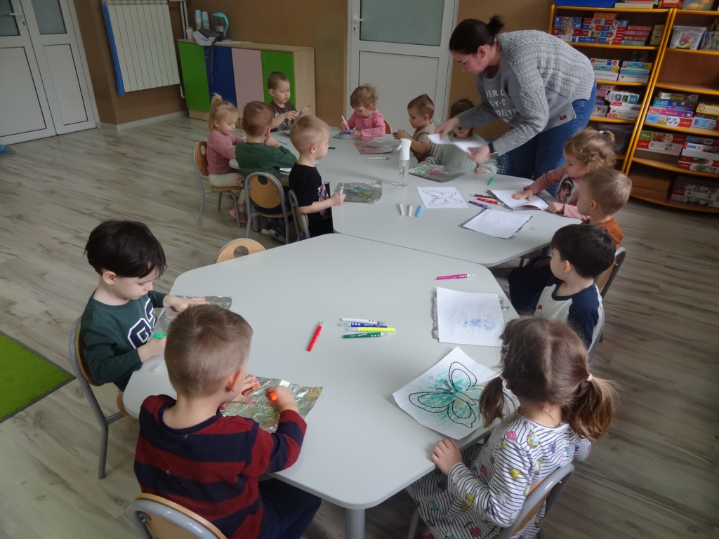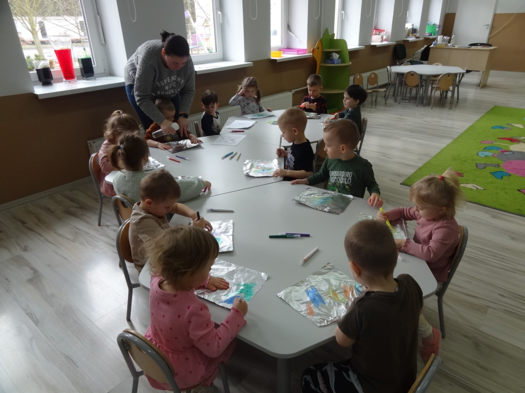 W części plastycznej dzieci wykonały pracę sensoryczną „Magiczny motyl” malowany na folii aluminiowej. Łączenie kolorów, wody i różnych faktur było dla dzieci źródłem radości i twórczej swobody