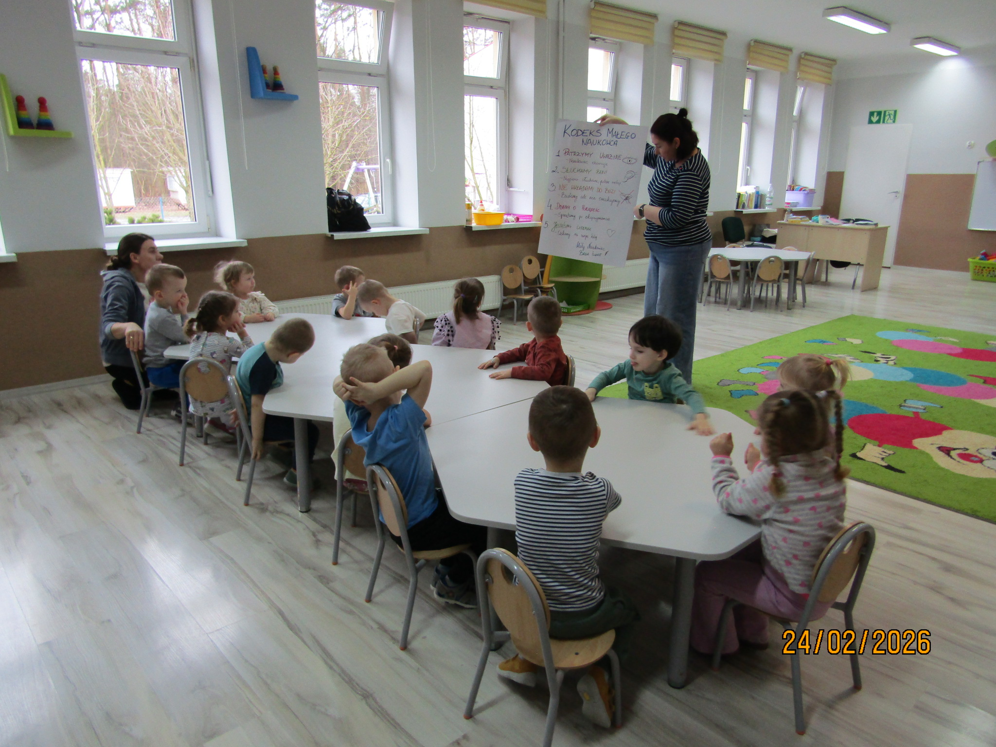 W poniedziałek wspólnie stworzyliśmy Kodeks Małego Naukowca. Dzieci zaproponowały zasady, które towarzyszyły nam podczas wszystkich doświadczeń – pracujemy ostrożnie, słuchamy poleceń, współpracujemy i sprzątamy po zakończonej pracy.