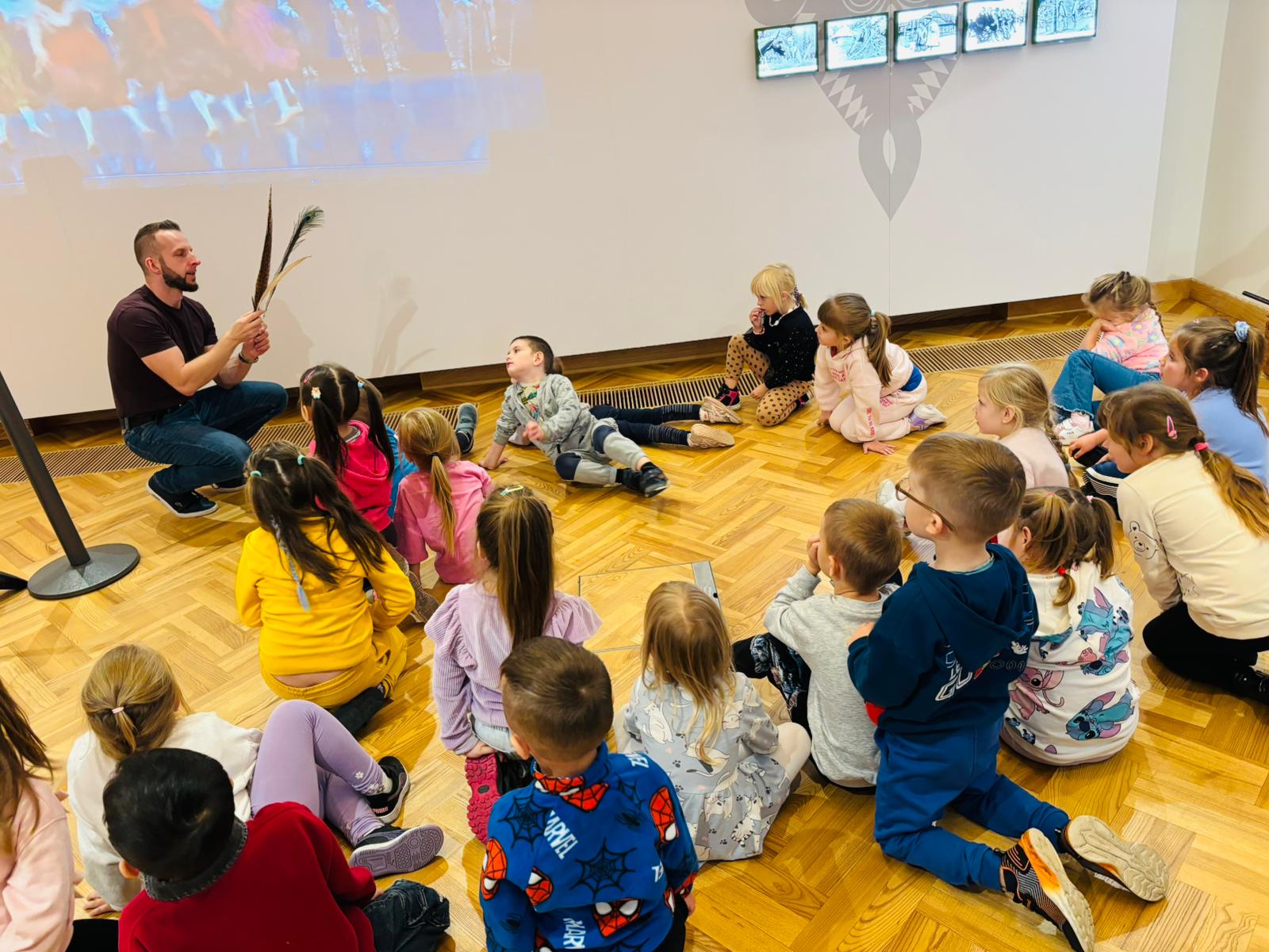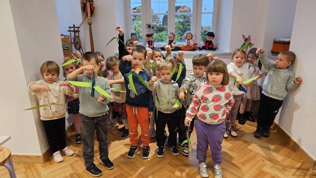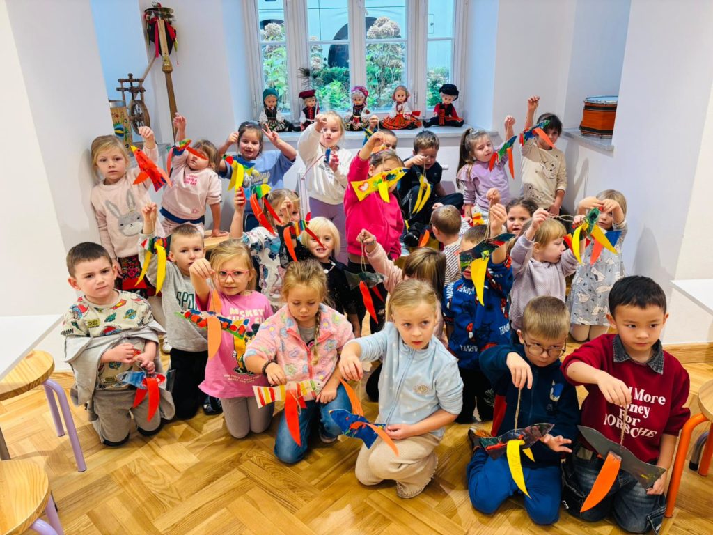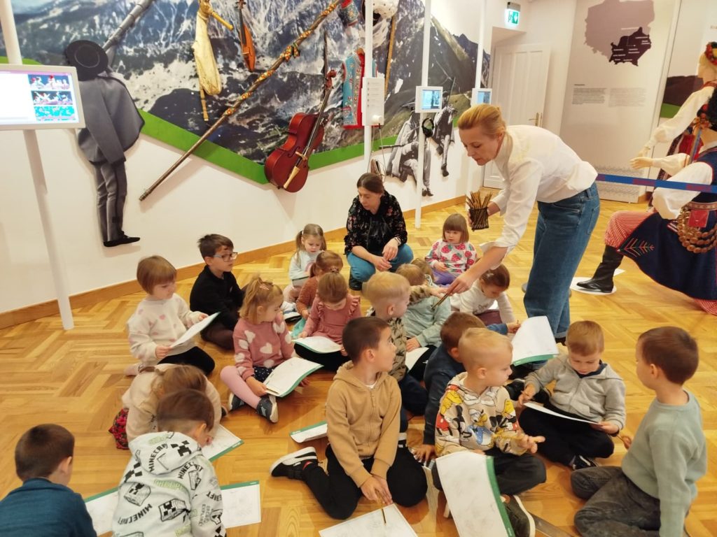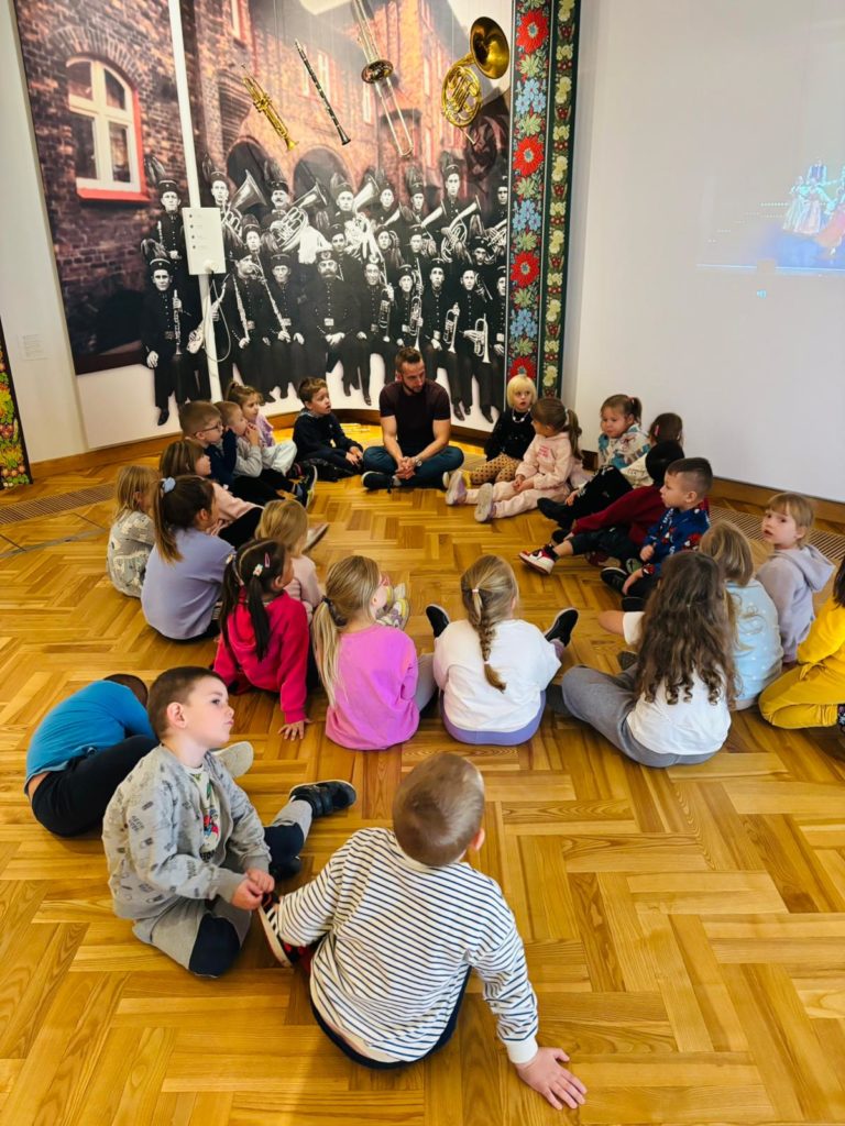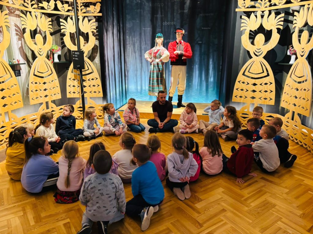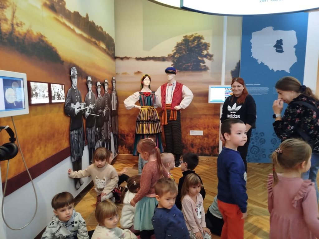 Dzieci miały okazję zwiedzić to niezwykłe miejsce, w którym tradycja spotyka się z historią i kulturą ludową naszego kraju. Przedszkolaki z ciekawością oglądały wystawy, poznając barwny świat polskiego folkloru, tańca i muzyki. 🎶💃