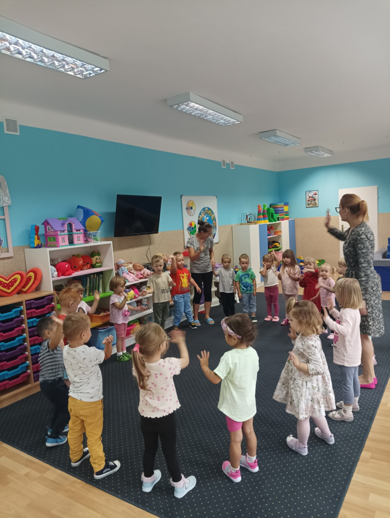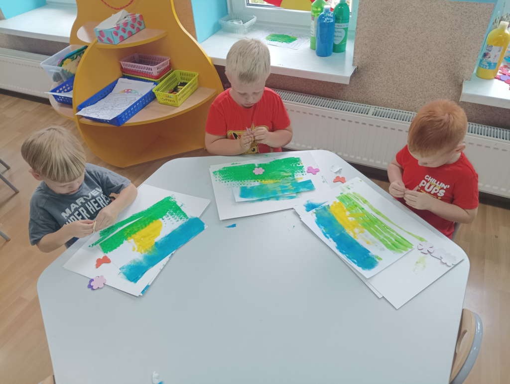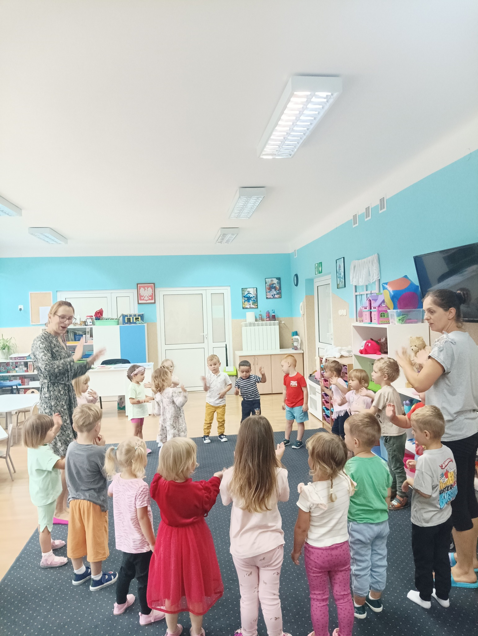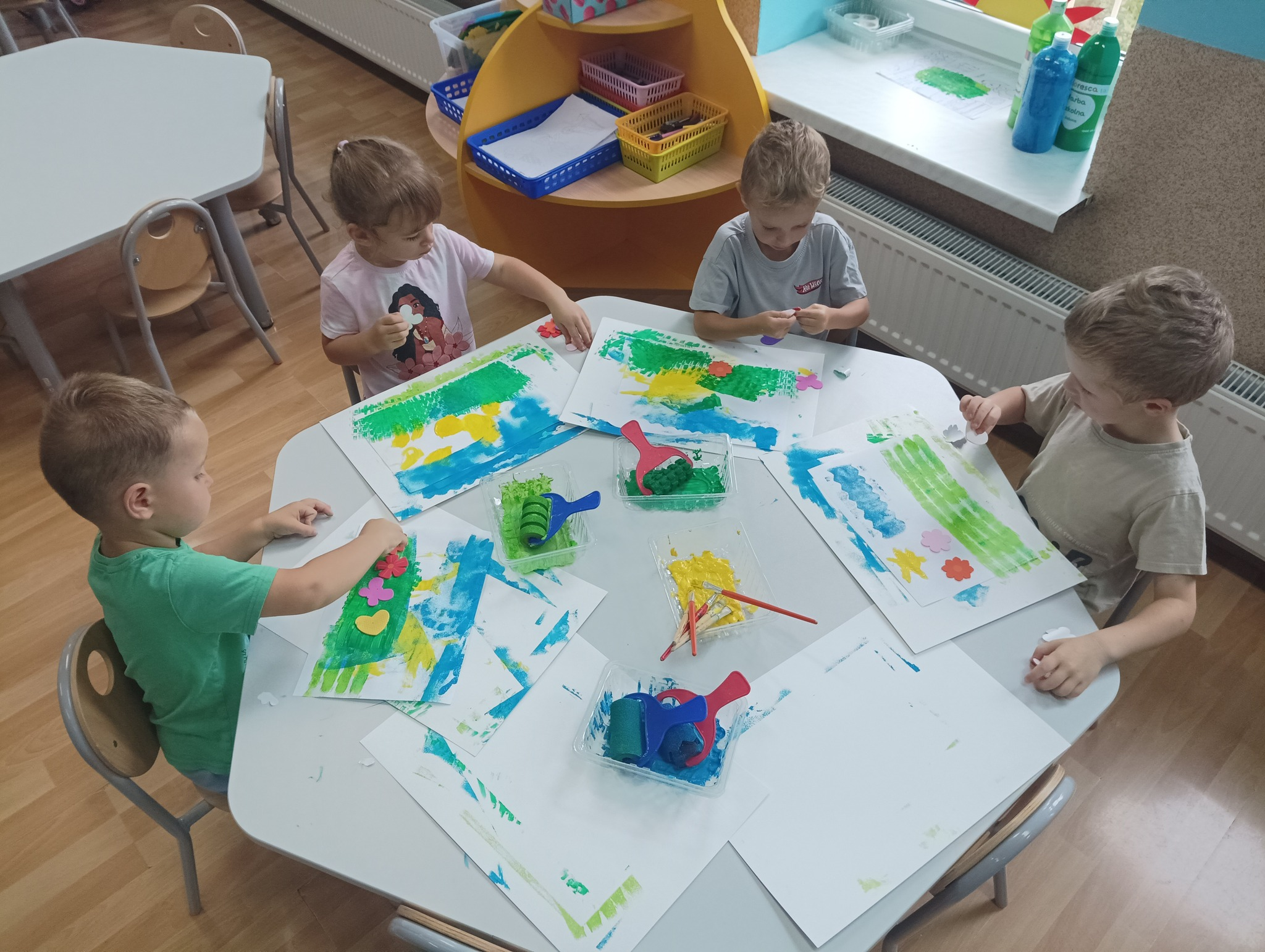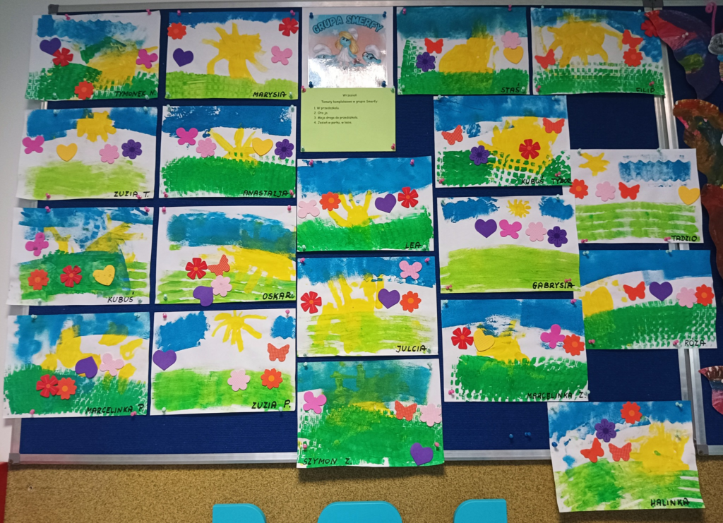 uczestniczyły w zabawach integracyjnych mających na celu budowanie pozytywnych relacji w grupie, tworzenie atmosfery zaufania i bezpieczeństwa, rozwijanie umiejętności komunikacyjnych i współpracy. Maluchy wspólnie bawiły się w nowej sali, poznały koleżanki i kolegów z grupy. Przedszkolaki spędziły czas na placu zabaw, wyruszyły także na pierwszy wspólny spacer wokół przedszkola. Dzisiaj Smerfy rozwijały zdolności plastyczne wykonując wspaniałe prace z wykorzystaniem farb, wałeczków oraz naklejek ![]()