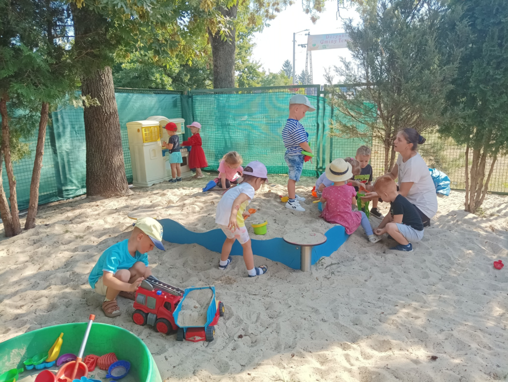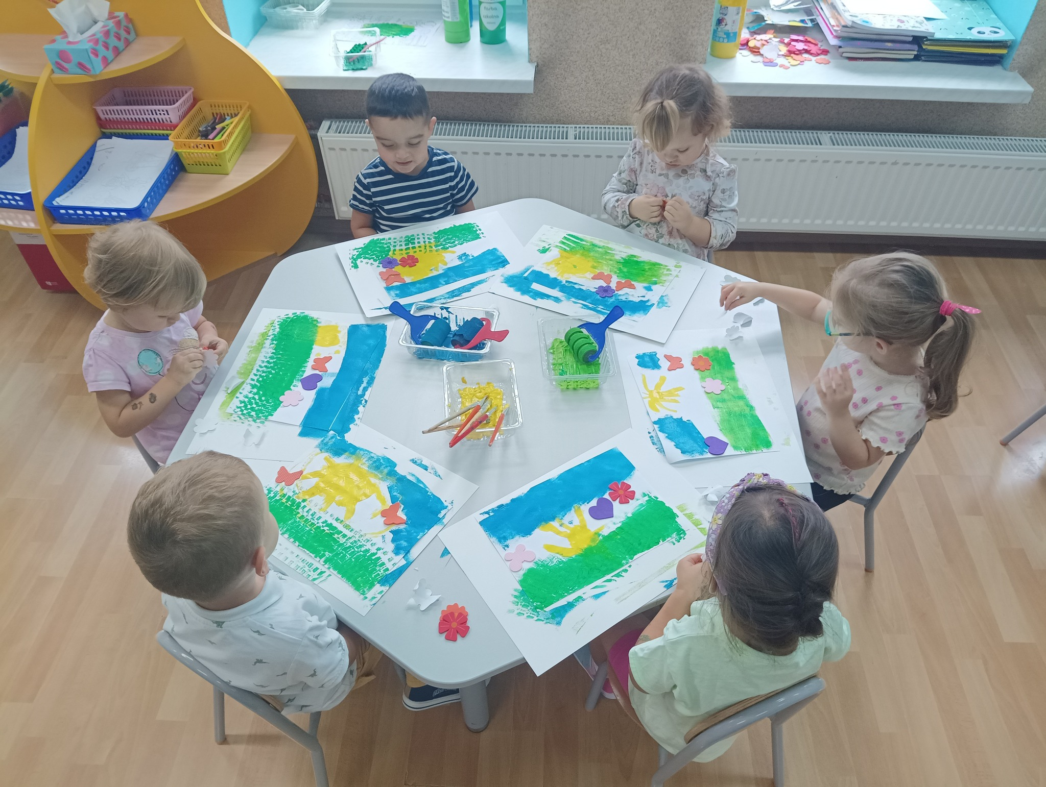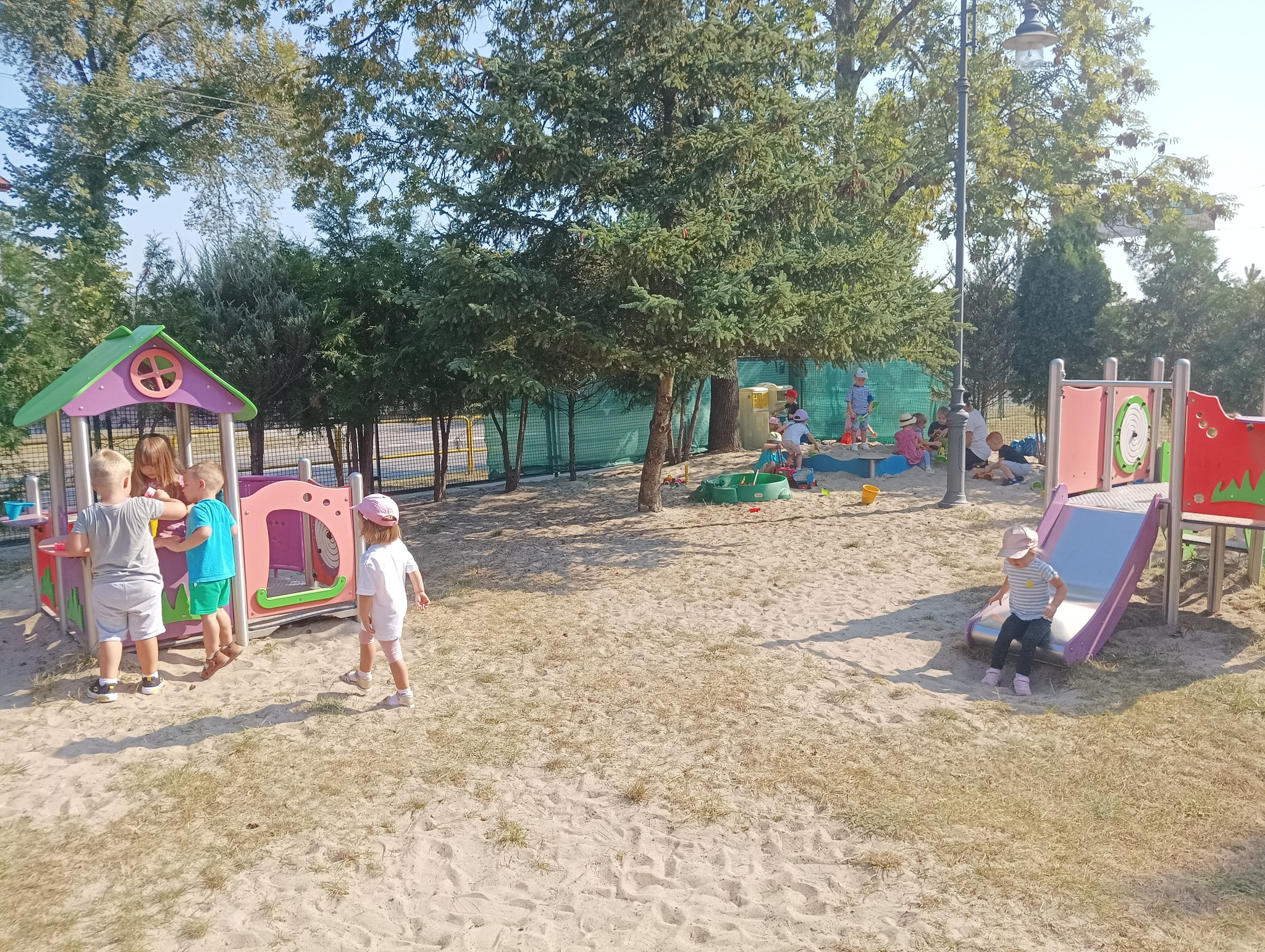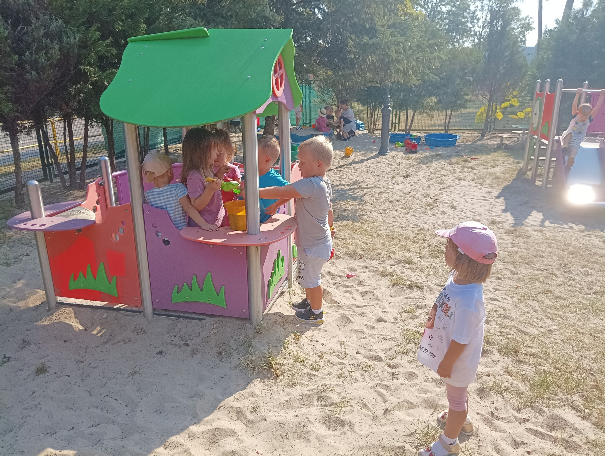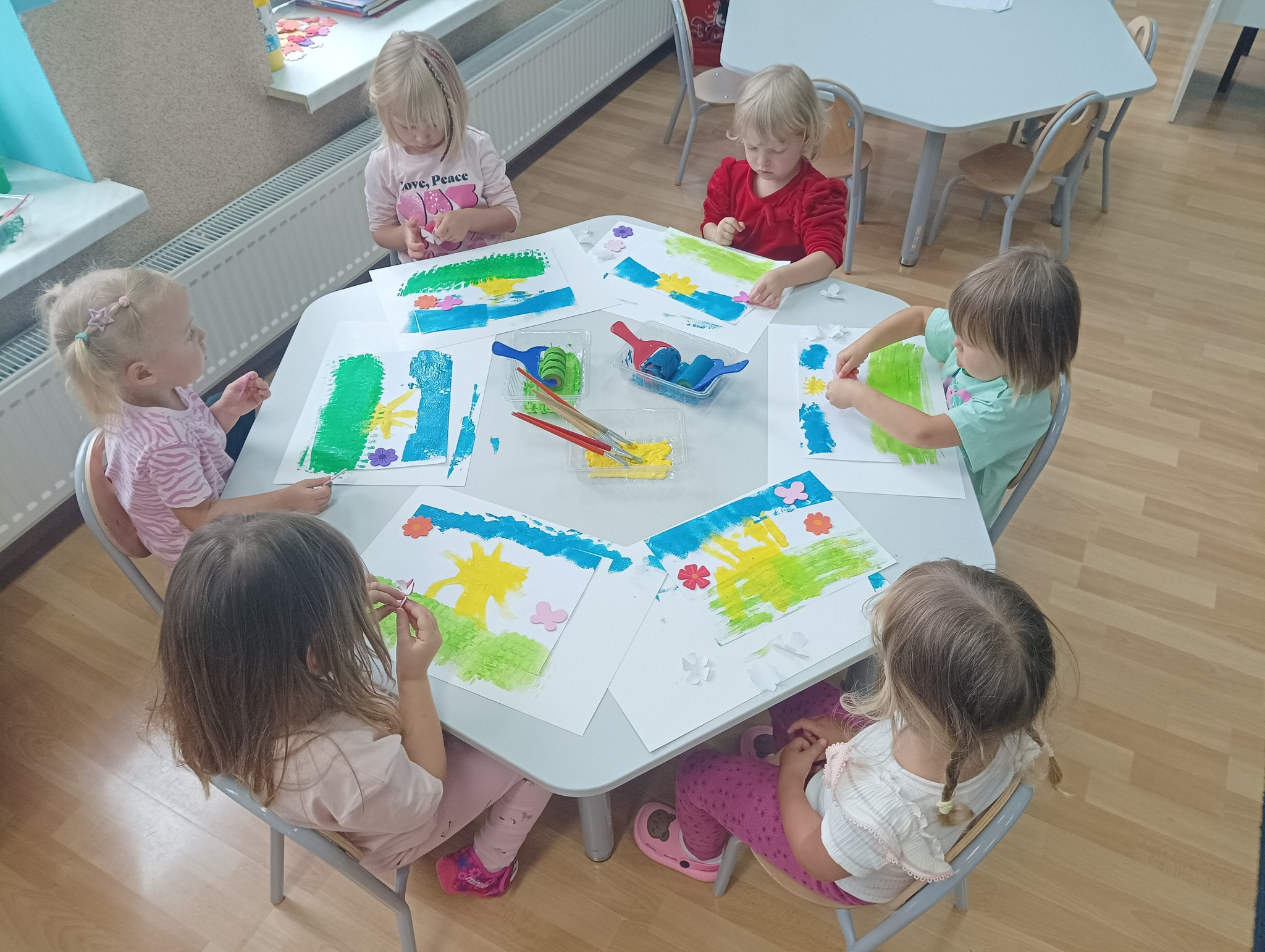 uczestniczyły w zabawach integracyjnych mających na celu budowanie pozytywnych relacji w grupie, tworzenie atmosfery zaufania i bezpieczeństwa, rozwijanie umiejętności komunikacyjnych i współpracy. Maluchy wspólnie bawiły się w nowej sali, poznały koleżanki i kolegów z grupy. Przedszkolaki spędziły czas na placu zabaw, wyruszyły także na pierwszy wspólny spacer wokół przedszkola. Dzisiaj Smerfy rozwijały zdolności plastyczne wykonując wspaniałe prace z wykorzystaniem farb, wałeczków oraz naklejek ![]()